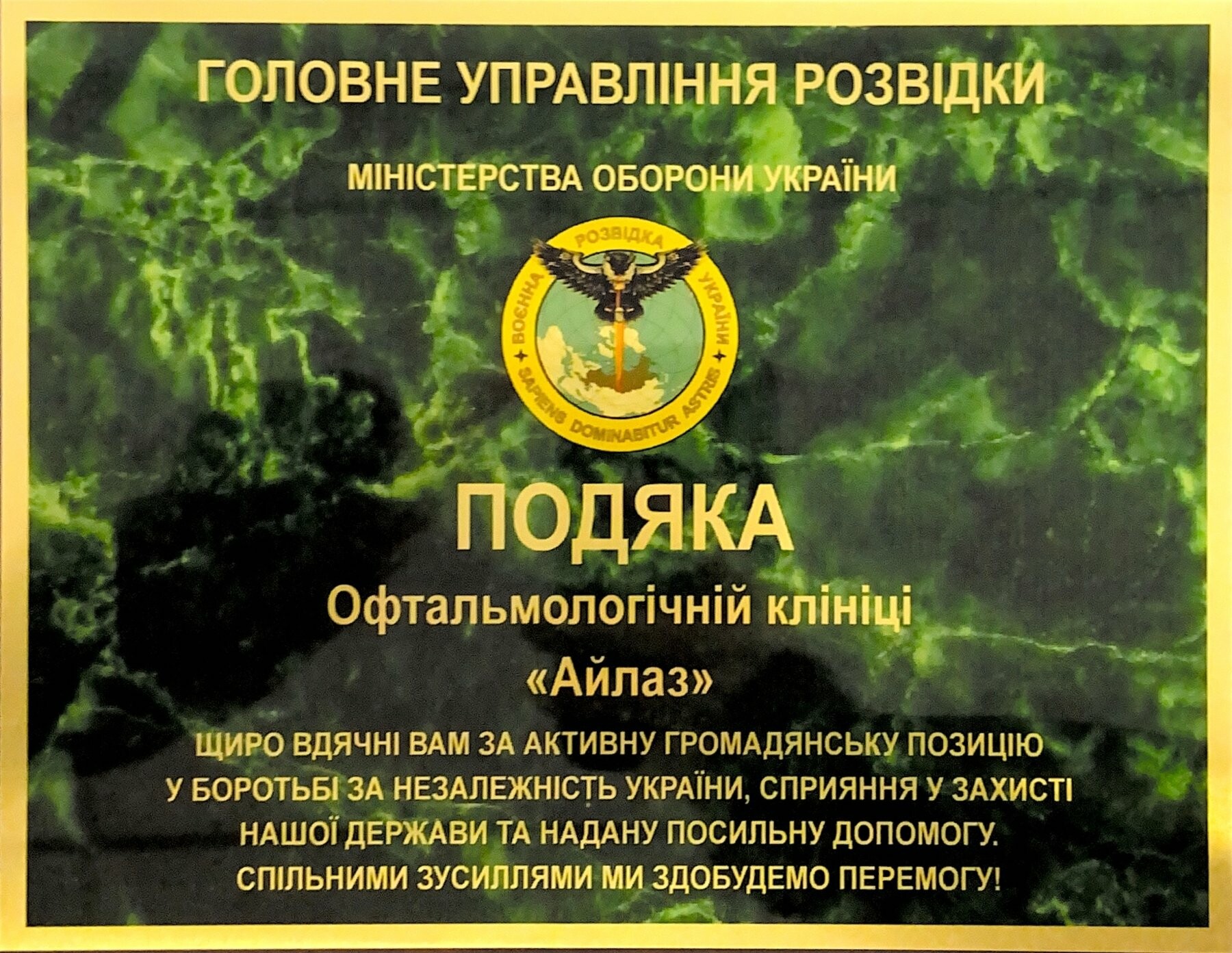 Офтальмологічний центр «АЙЛАЗ» отримав офіційну подяку від Головного управління розвідки Міністерства оборони України за професійну допомогу та активну громадянську позицію у боротьбі за незалежність України.